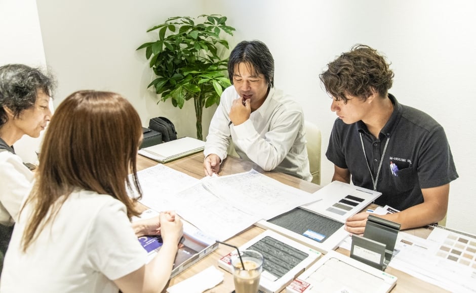 M-HOUSEが長くお付き合いする建築士の先生は、腕もさることながら“仕事人として”尊敬できるような「お客様のためにいい家をつくる」ことに真っ直ぐな方が集まっています。 打ち合わせでも和気あいあい、経験豊かな先生方との打ち合わせは、これまた経験豊かなM-HOUSEスタッフが同席。話すうちにお互いがこだわりを強く出しすぎてしまい、当初決めていた予算をオーバーしないかなど、お客様をしっかりサポートし、打ち合わせをグリップします。