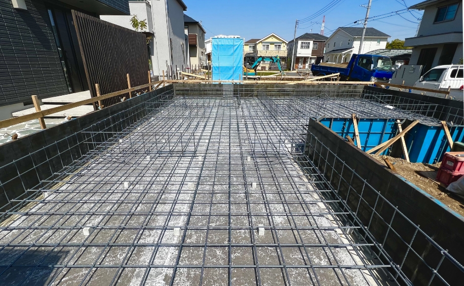 根切り、防湿シート、砕石工事などを行い、水平精度を保つためコンクリートを流し(捨てコンクリート)平らにした下地の上に骨組みになる鉄筋を組み、土台の枠を組んで、コンクリートを流し込み固めます。家の土台となる基礎はとても重要な工事なので、急がずしっかりと固まるまで養生して完成させます。