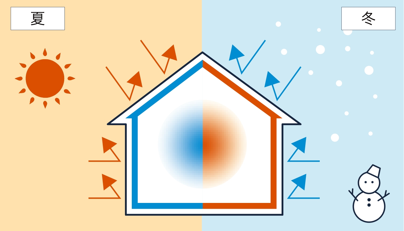 住宅の断熱性を高めるため、高性能な断熱材を用いて外気からの熱の出入りを遮断します。室内温度を安定させることで、年間を通して快適な居住空間を実現し、夏は涼しく、冬は暖かく過ごすことができます。また、冷暖房効率の向上によって、省エネも叶い、寒暖差で生じる結露防止にも繋がります。