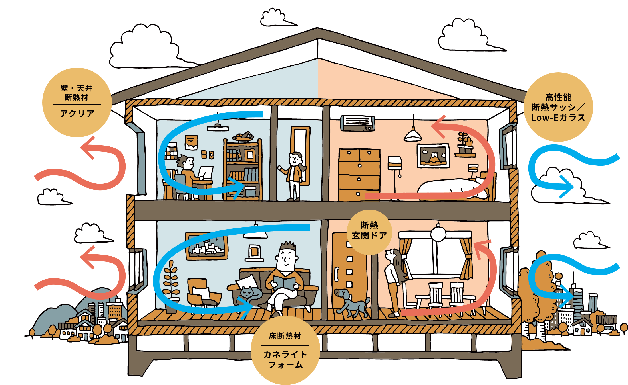 高気密・高断熱の家は、密閉性が高く、高性能の断熱材により外気温の影響を受けにくいため、冷暖房の効率化・住宅全体の室温均一化が叶い、年間を通じてエネルギー消費量が大幅に削減されます。高気密・高断熱にこだわることは、省エネ性能の向上に繋がるとともに、断熱以外にも遮音・防音性能を持つ断熱材を使用することで遮音性も向上し、快適な室内環境を実現します。