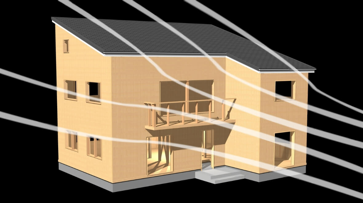 モノコック構造は、床、壁、天井の六面が一体となって力を分散します。建物の壁面で受ける風圧力を建物全体に伝えてバランスよく抵抗し、風の影響に対して高い耐性を示します。