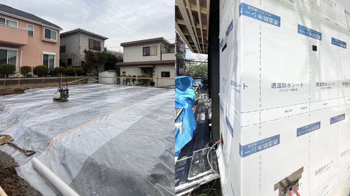 基礎に防湿フィルムを施工し、地盤面からの湿気とシロアリをシャットアウト。さらに、外壁内部に「防湿層」と呼ばれる内部結露を防止するフィルム、室内壁の下地に防湿気密シートを施工します。