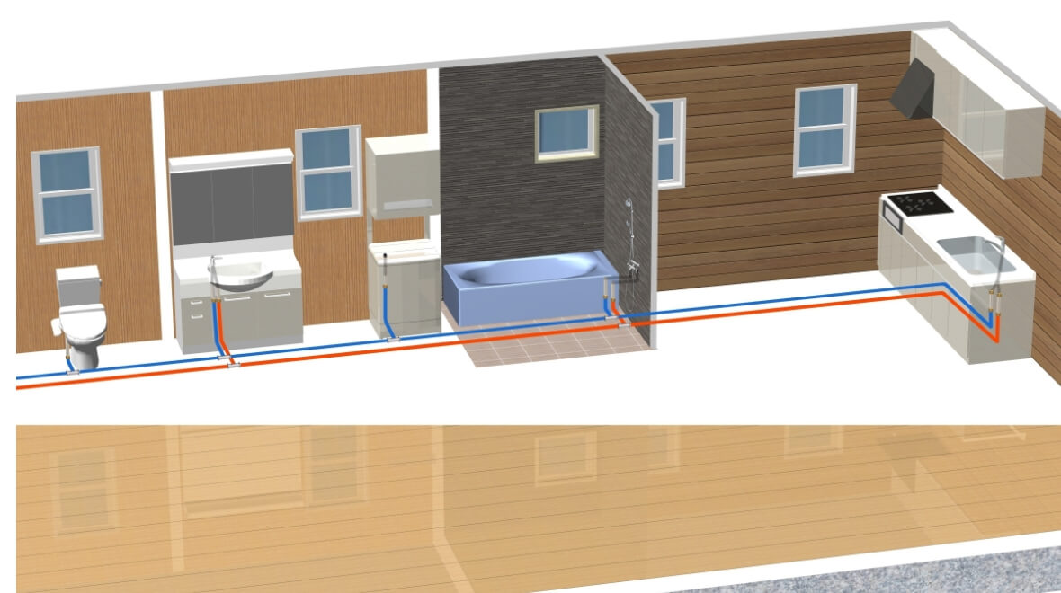 住宅や建物全体の給水・給湯を「ヘッダー」と呼ばれる分配装置で一元管理。漏水のリスクが少なく、ヘッダーから各端末水栓へ直接給水・給湯するため、水圧が安定します。耐熱性や耐腐食性にも優れ、衛生的です。