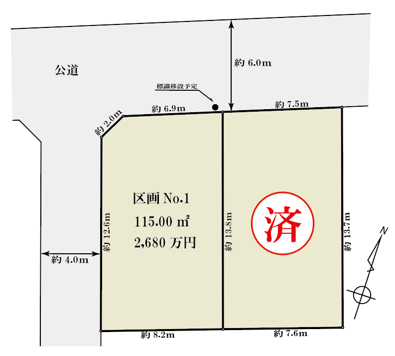 接道:北側(公道)約6.0m・西側(公道)約4.0m